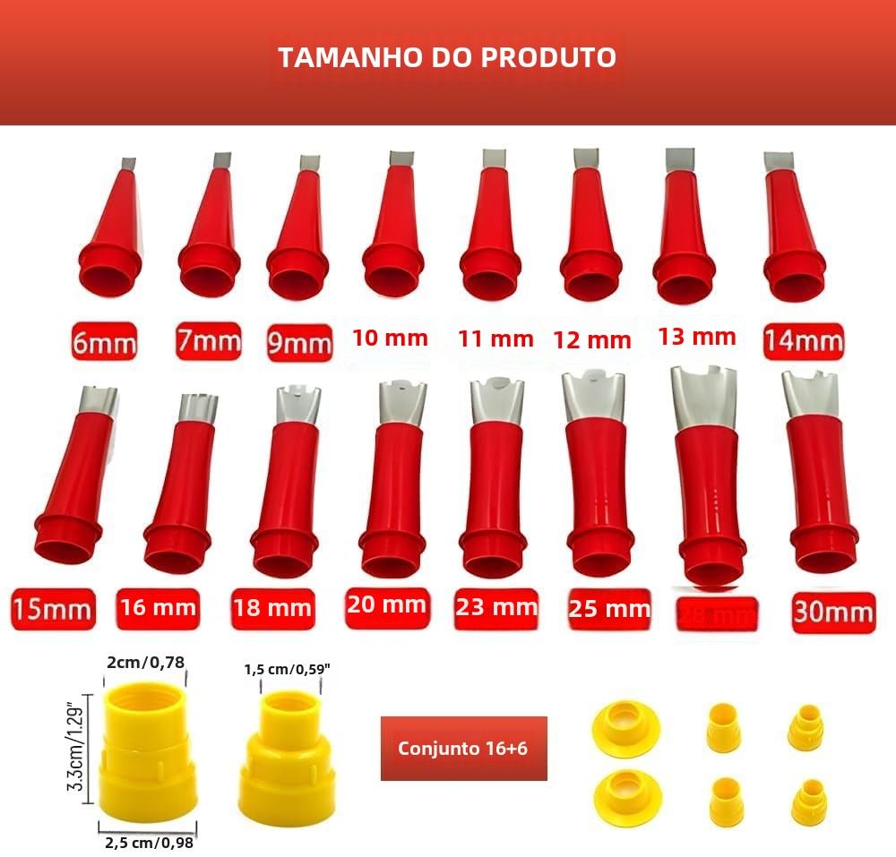 Esta embalagem contém 22 peças: 16 tamanhos diferentes de bicos de vedação de 6mm a 30mm e 6 tomadas de ligação. Este conjunto abrangente satisfaz uma variedade de necessidades de enchimento e garante versatilidade e conveniência em diversas aplicações de vedação.