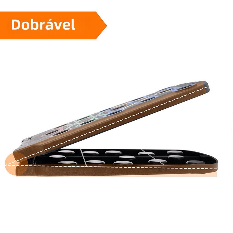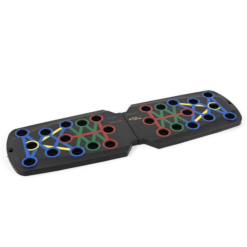 Tábua de flexões portátil, com uma estrutura dobrada que mantém a barra de flexões no interior e uma pega na parte superior que a torna fácil de levar para qualquer lugar onde se possa fazer exercício.