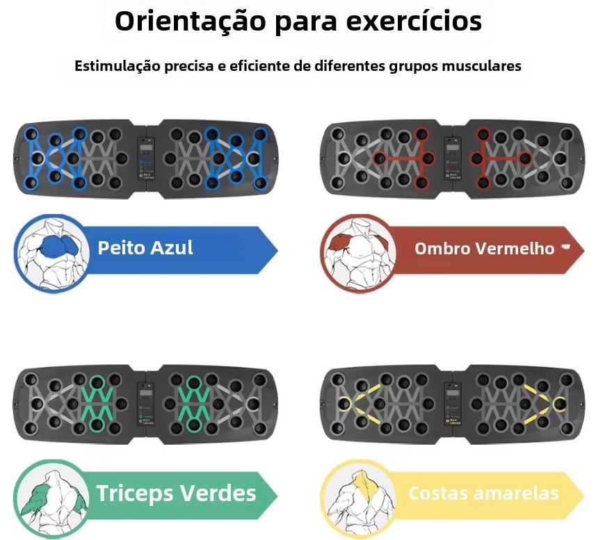 Cores diferentes indicam grupos musculares diferentes, como profissionais que o guiam através de um treino de força intenso. Pode fazer exercícios para as costas, exercícios para o peito, exercícios para os ombros, exercícios para os tríceps e, claro, pode desafiar mais padrões de exercícios para se elevar a um nível superior.